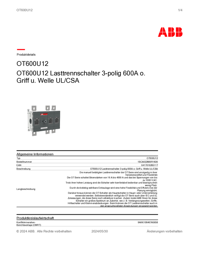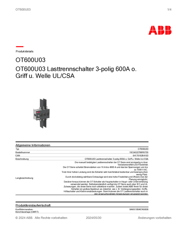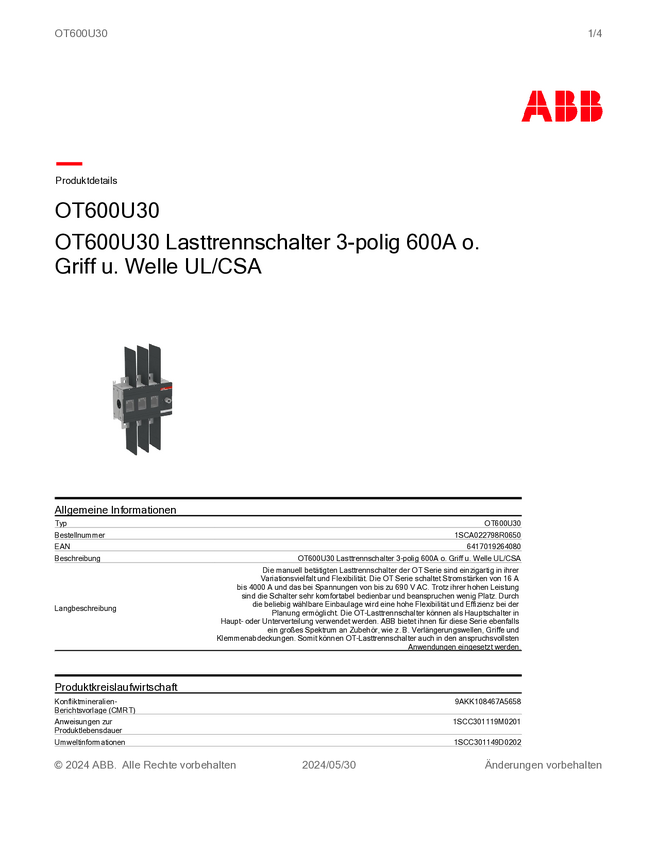 ABB OT600U30 Rozłącznik 600 A 1000 V 1 szt.