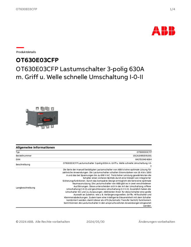 ABB 1SCA123592R1001 Przełącznik obejściowy OT630E04YP, 1000 V, 630 A