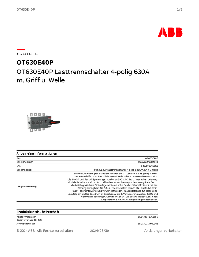 ABB 1SCA022776R3390 Rozłącznik OT630E04, 1000 V, 630 A