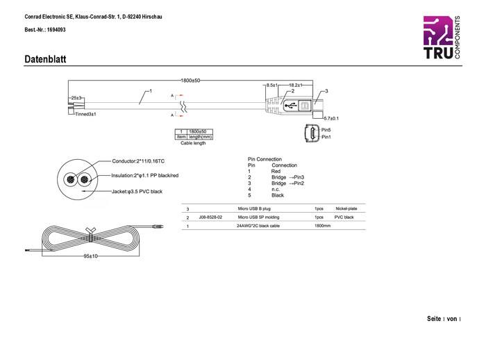 Konfekcjonowane złącze Micro USB-B z otwartym końcem kabla TRU COMPONENTS, 1.80 m, 1 szt.