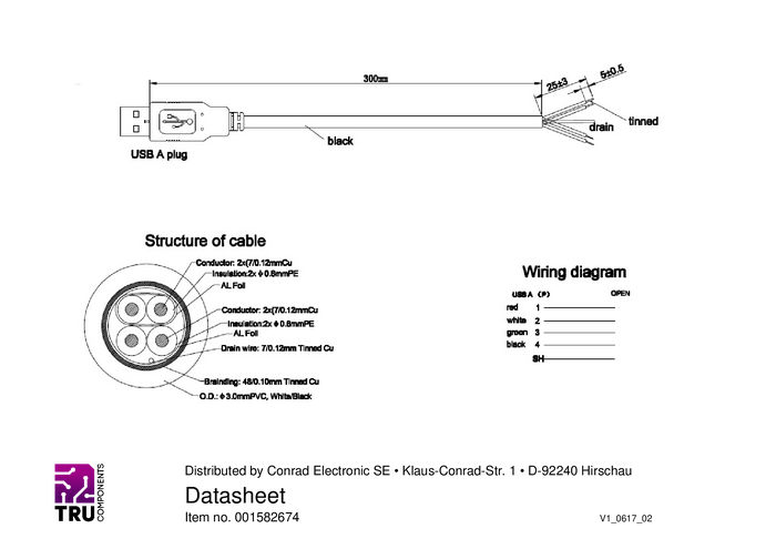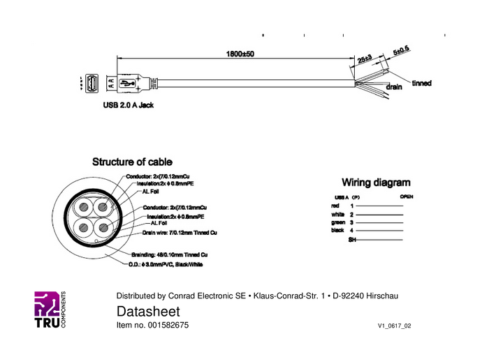 Złącze USB typu A 2.0 z otwartym końcem kabla TRU COMPONENTS 1582675, 1.80 m, 1 szt.