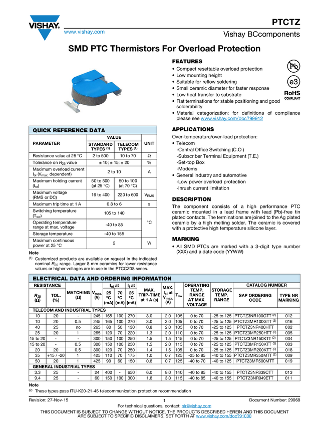 PTC Thermistors, Overload Protection for Telecommunication