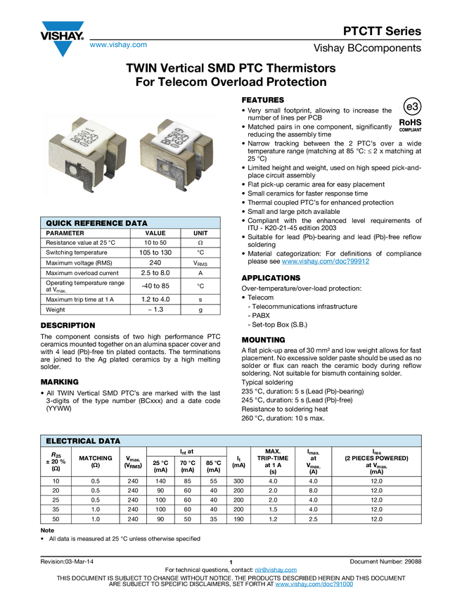 TWIN Vertical SMD PTC Thermistors for Telecom Overload Protection