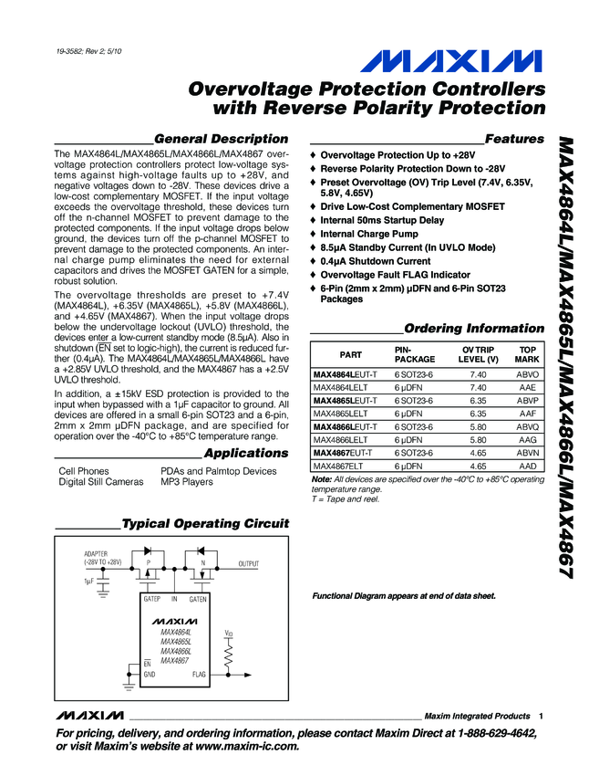 MAX4864L, MAX4865L, MAX4866L, MAX4867 Overvoltage Protection Controllers with Reverse Polarity Protection