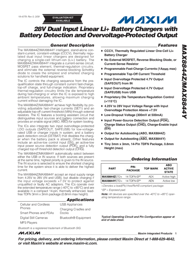 MAX8844Y, MAX8844Z 28V Dual Input Linear Li+ Battery Chargers with Battery Detection and Overvoltage-Protected Output