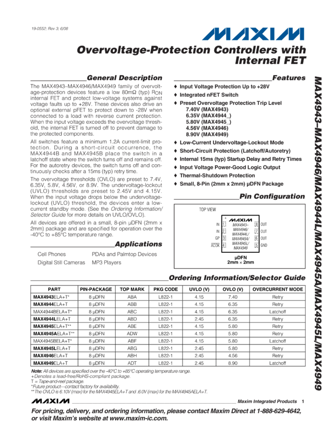 MAX4943, MAX4944, MAX4944L, MAX4945, MAX4945L, MAX4946, MAX4949 Overvoltage-Protection Controllers with Internal FET