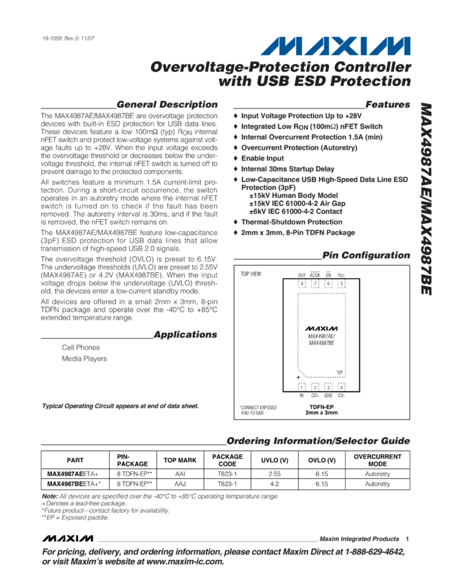 MAX4987AE, MAX4987BE Overvoltage-Protection Controller with USB ESD Protection