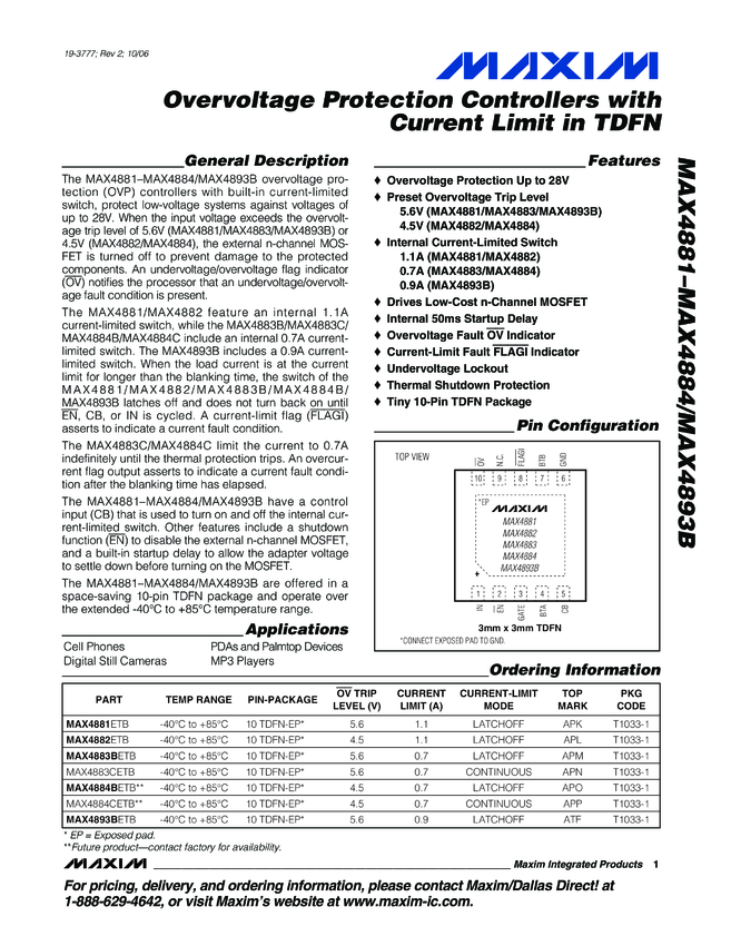 MAX4881, MAX4882, MAX4883, MAX4884, MAX4893B Overvoltage Protection Controllers with Current Limit in TDFN