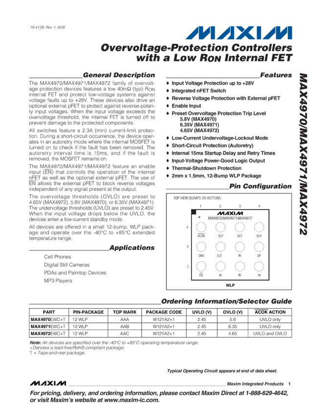 MAX4970, MAX4971, MAX4972 Overvoltage-Protection Controllers with a Low RON Internal FET