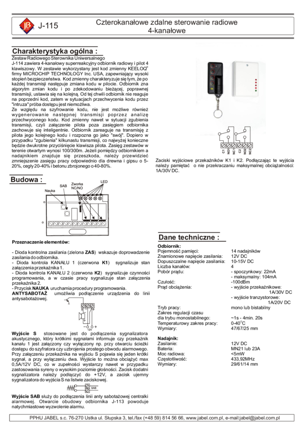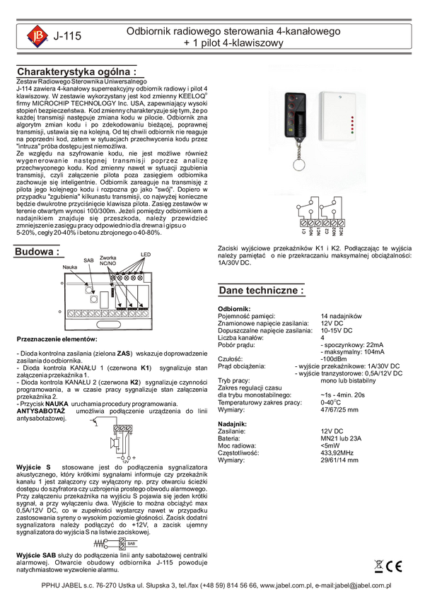 J-115 Odbiornik radiowego sterowania 4-kanałowego + 1 pilot 4 klawiszowy