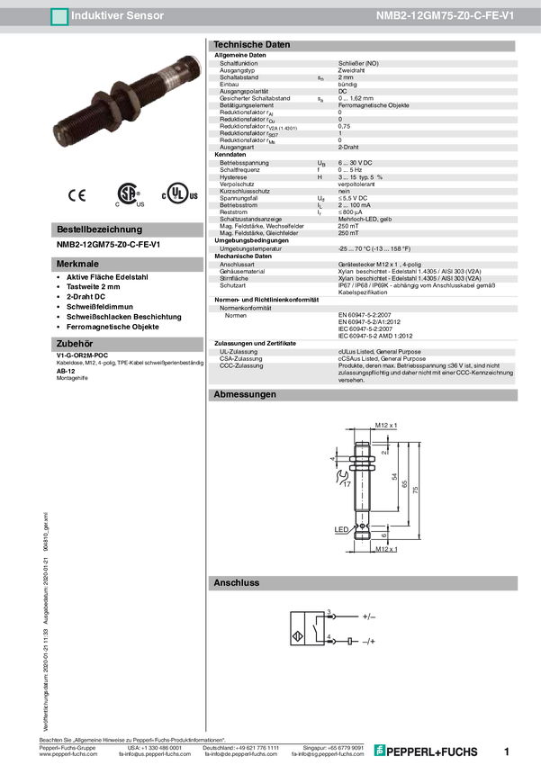 Pepperl+Fuchs Czujnik indukcyjny podtynkowy dwużyłowe NMB2-12GM75-Z0-C-FE-V1