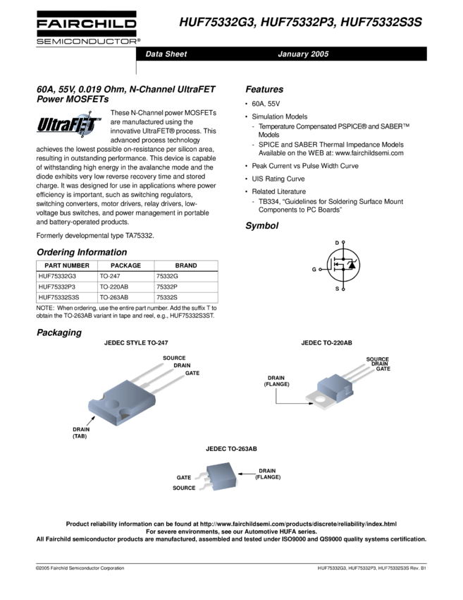60A, 55V,0.019 Ohm, N-Channel UltraFET P ower MOSFETs