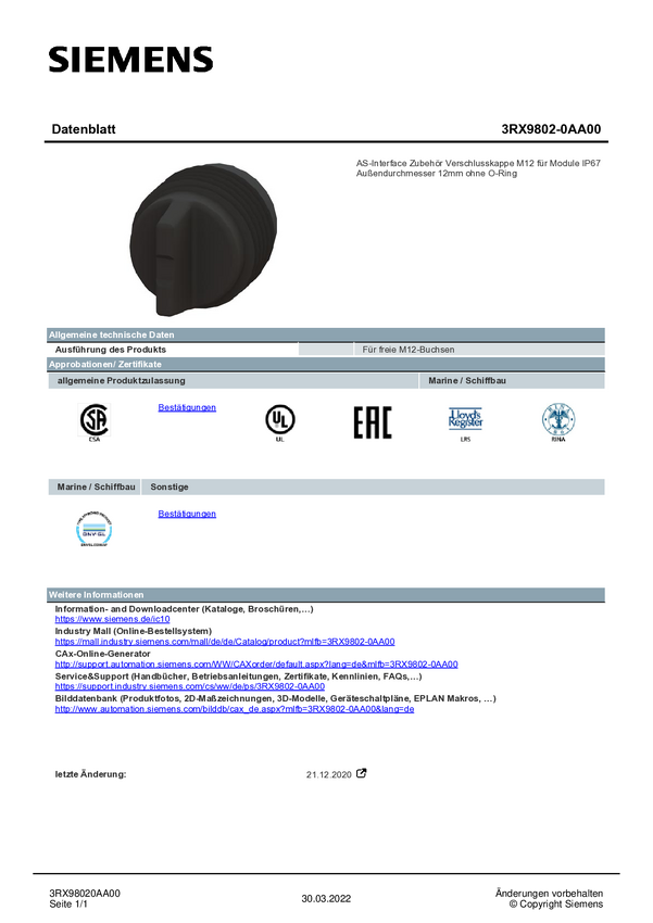 Akcesoria montażowe PLC Siemens 3RX9802-0AA00 3RX98020AA00