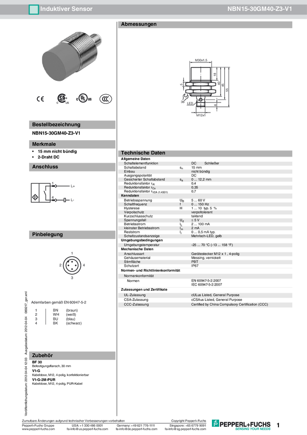 Pepperl+Fuchs Czujnik indukcyjny nie podtynkowy dwużyłowe NBN15-30GM40-Z3-V1