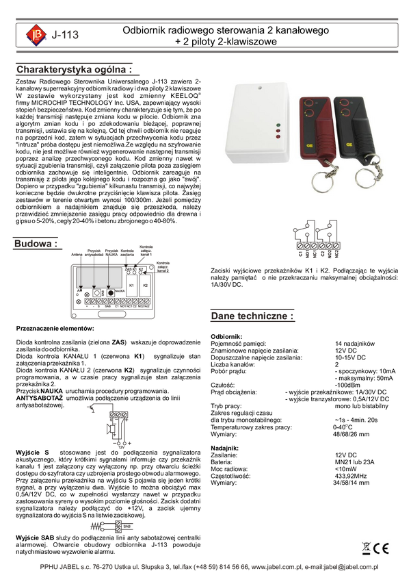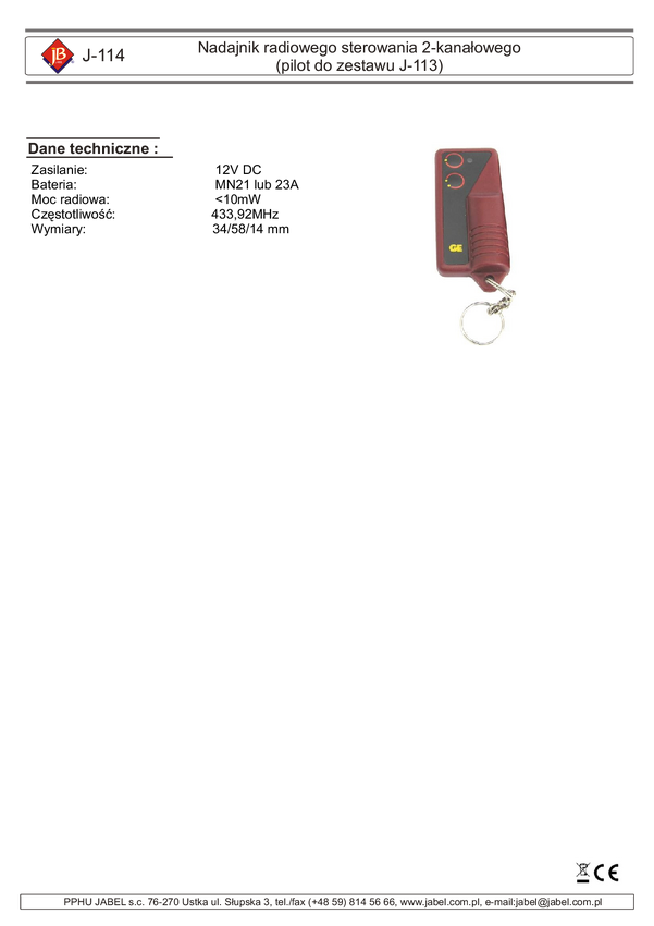 J-114 Nadajnik radiowego sterowania 2kanałowego (dodatkowy pilot do zest.J-113)