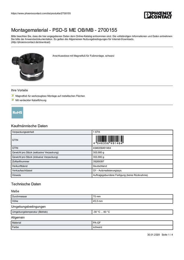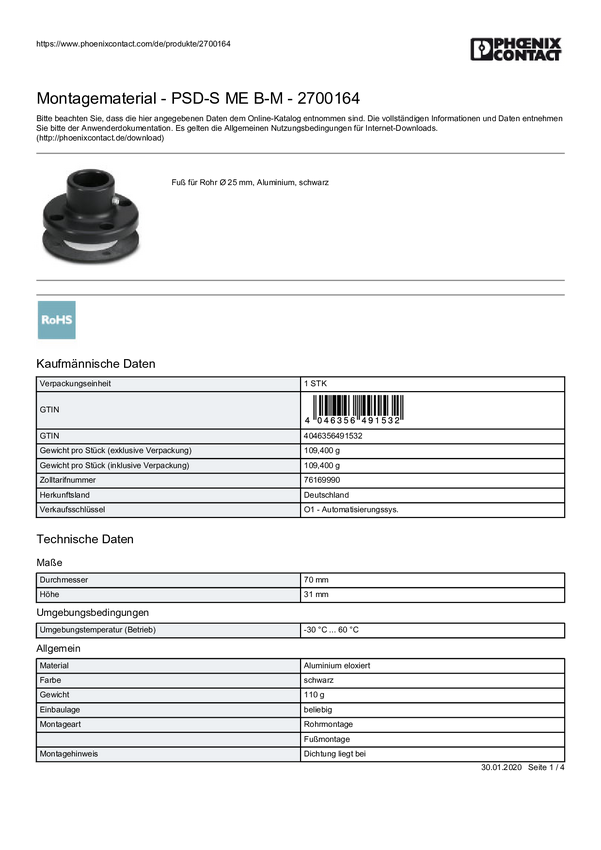 Akcesoria montażowe Phoenix Contact PSD-S ME OB/MB (Ø x W) 70 mm x 45.5 mm 1 szt.