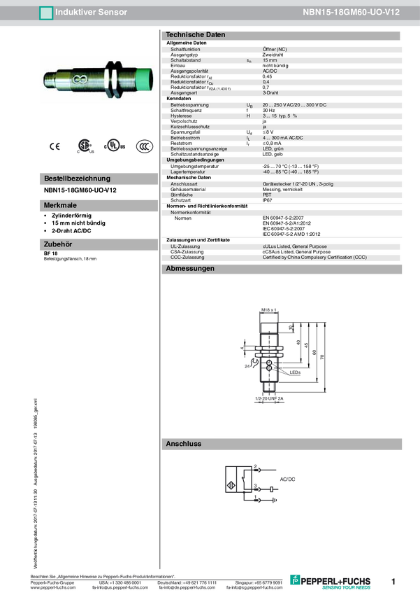 Pepperl+Fuchs Czujnik indukcyjny nie podtynkowy dwużyłowe NBN15-18GM60-UO-V12