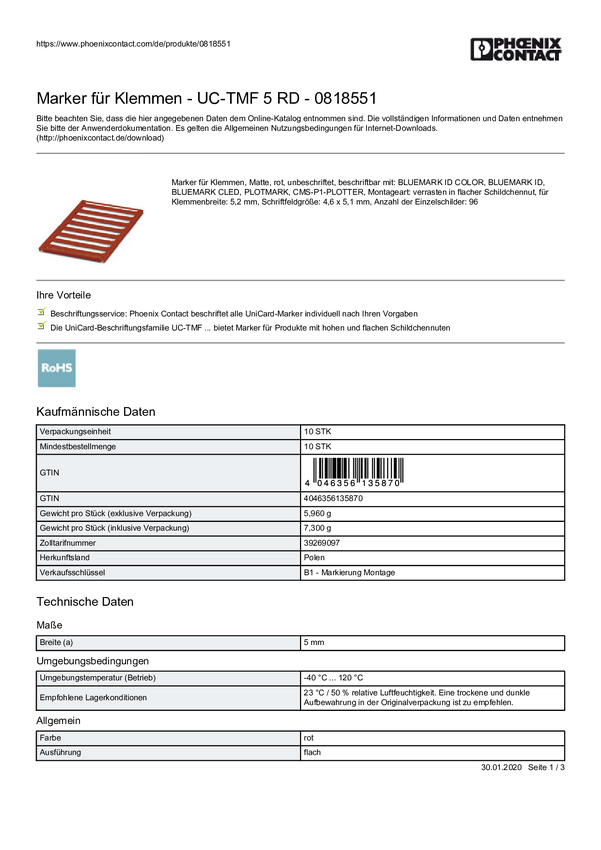 Phoenix Contact 0818551 Oznaczenie zacisków czerwony 10 szt.