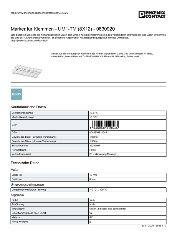 Phoenix Contact 0830920 Oznaczenie zacisków biały 10 szt.