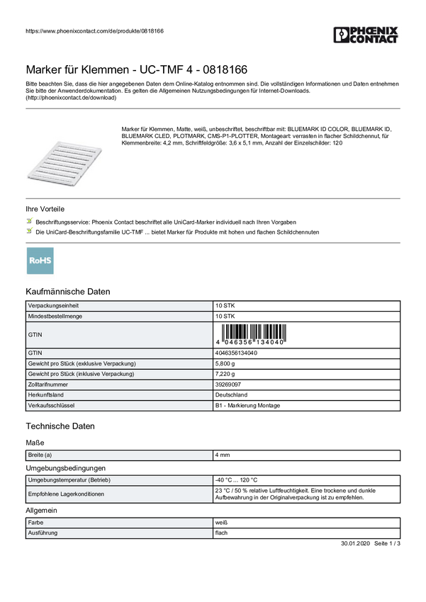 Phoenix Contact 0818069 Oznaczenie zacisków biały 10 szt.