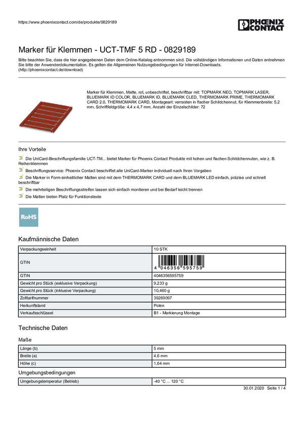 Phoenix Contact 0829189 Oznaczenie zacisków czerwony 10 szt.