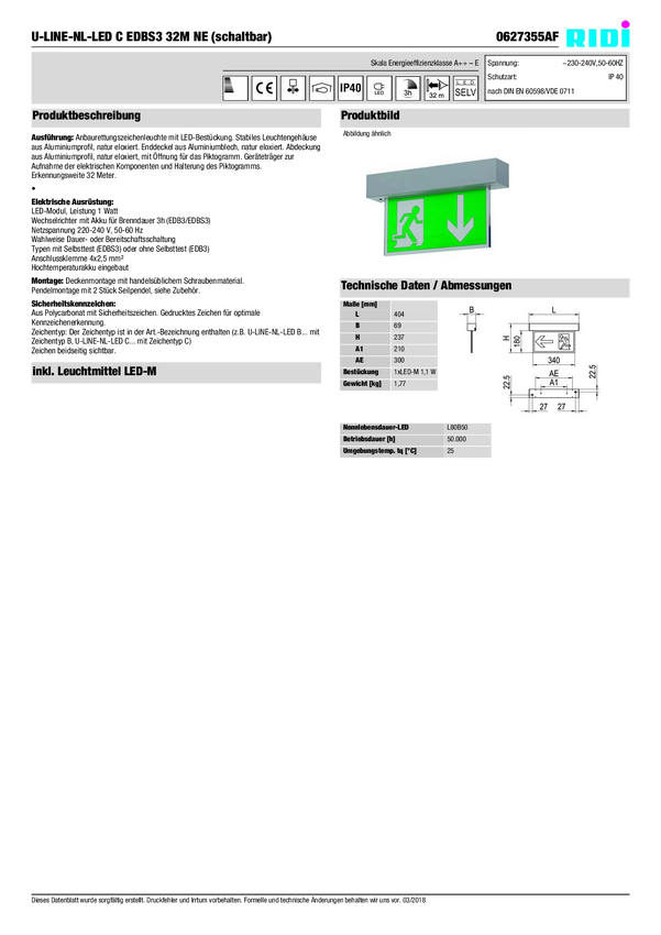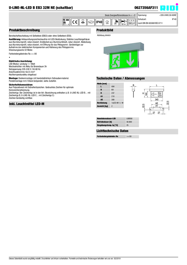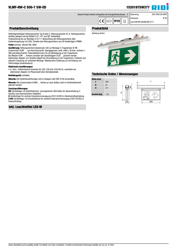 RIDI 0627220AF Oznakowanie drogi awaryjnej z podświetleniem LED EEK G (A - G)