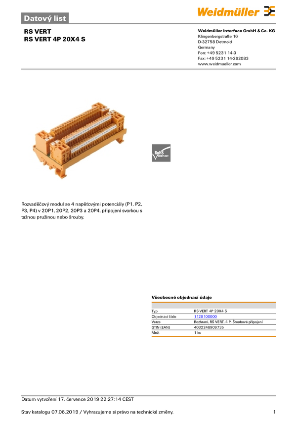 Interfejs, RS VERT, 4 P, złącze śrubowe RS VERT 4P 20X4 S Weidmüller Zawartość: 1 szt.