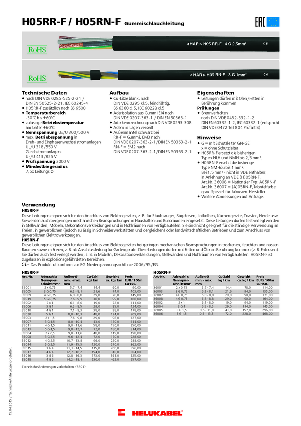 Przewód z gumowym płaszczem Helukabel 35004-500, 2 x 2.5 mm², Przewód pleciony goły, zgodnie z DIN VDE 0295 Kl.5, z cien