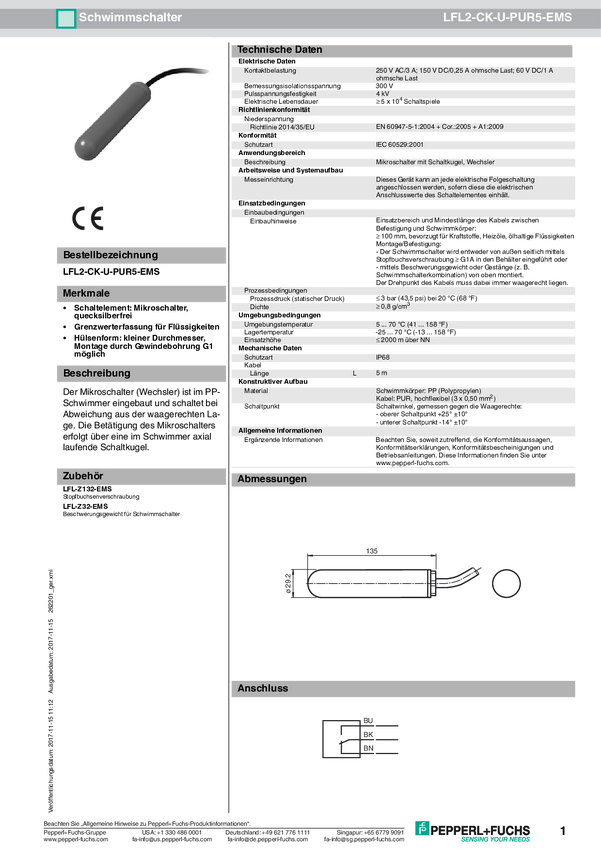 Pepperl+Fuchs 262201 Przełącznik pływakowy LFL2-CK-U-PUR5-EMS 1 szt.