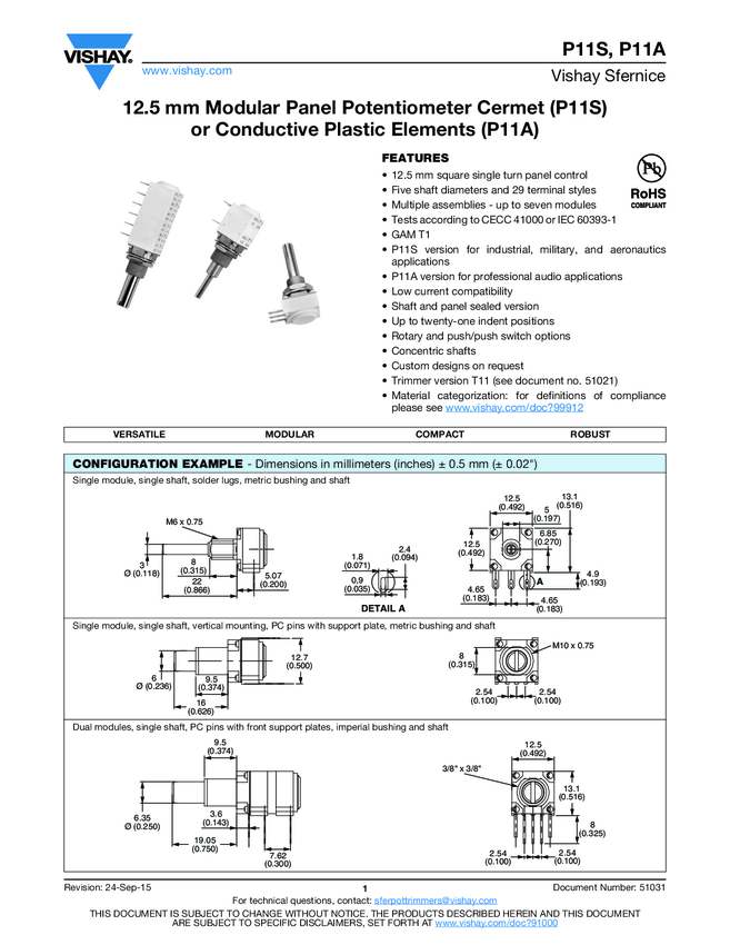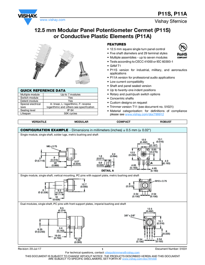 12.5 mm Modular Panel Potentiometer Cermet (P11S) or Conductive Plastic Elements (P11A)
