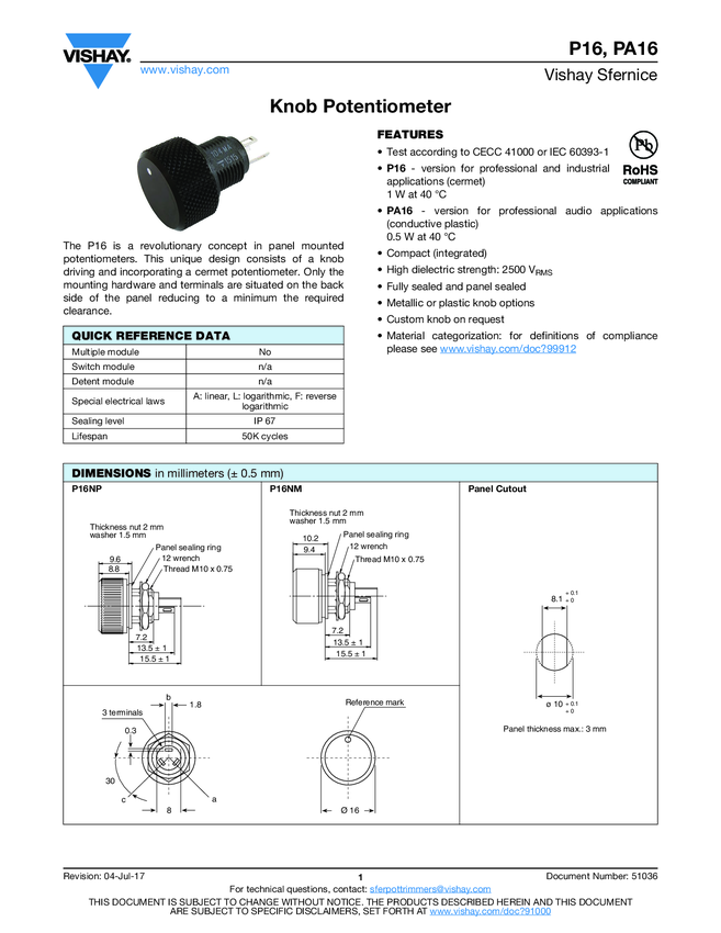 Potencjometr 16 mm, tol 20%; prod.rez. 500-1M B-liniowy 0,2W; A-log 0,1W; el.260st; mech 300st, trwałość 100.000 cykli; ośka okr.lub ścięta lub knurled - podobny do Alpsa RK163