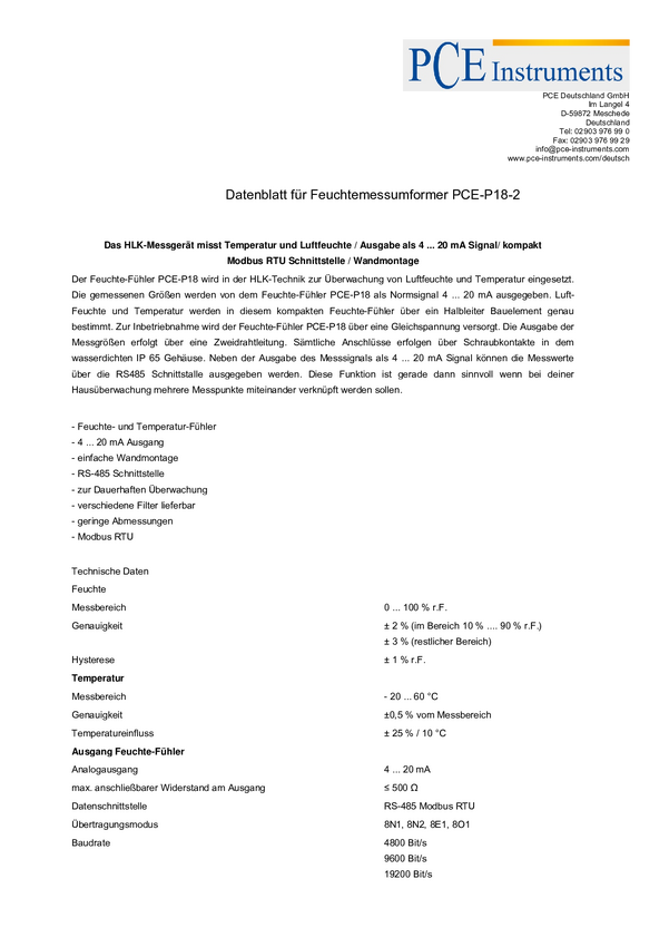 Higrometr PCE Instruments PCE-P18-1A0E0