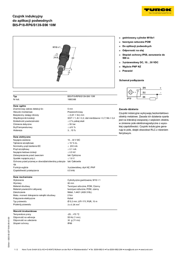 Czujnik indukcyjny Turck BI5-P18-RP6/S139-S90 10M, 10 - 30 V, 1 szt.