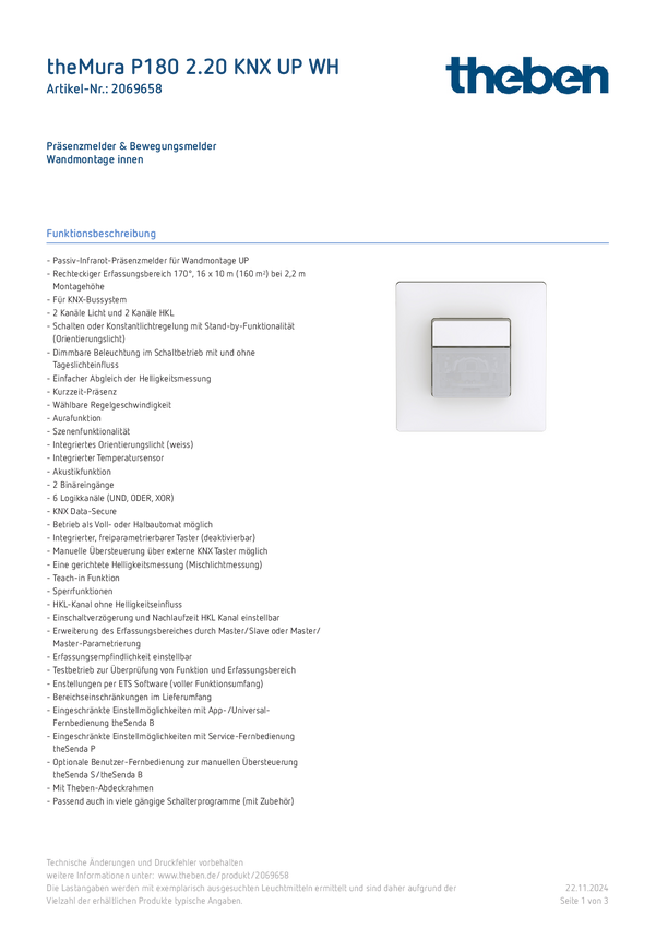 Detektor obecności Theben 2069655 theMura P180 KNX UP WH