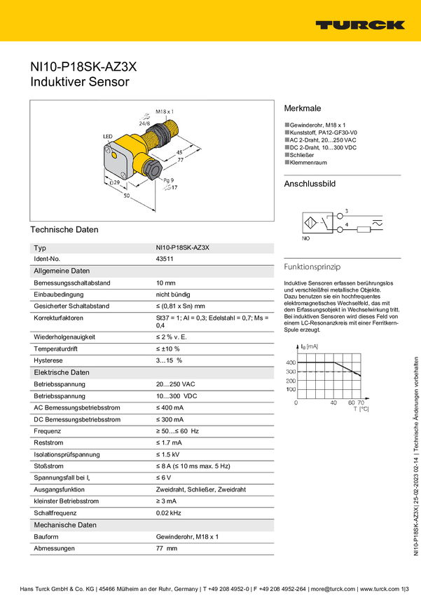 Turck Czujnik indukcyjny nie podtynkowy PNP, Zamykający NI10-P18SK-AP6X