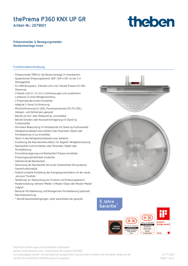 Detektor obecności Theben 2079001 thePrema P360 KNX UP GR