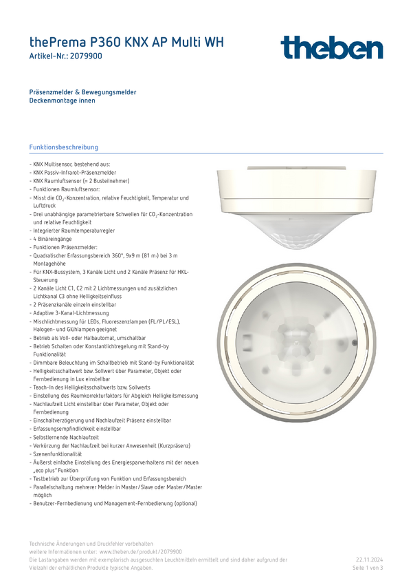 Czujnik wielofunkcyjny Theben 2079900 thePrema P360 KNX AP Multi WH