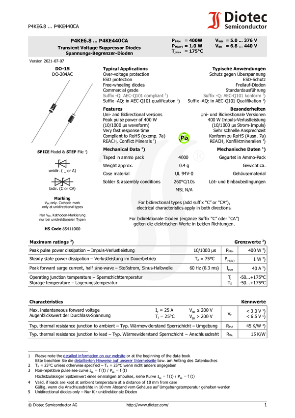 Diotec Dioda TVS P4KE300A DO-15 315 V