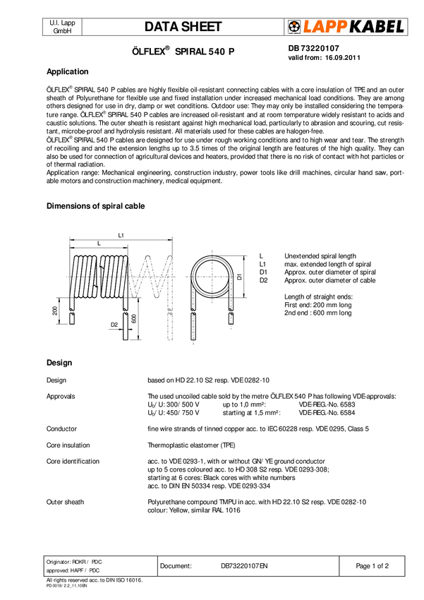 LAPP;71220136;Przewód spiralny;ÖLFLEX® SPIRAL 540 P600 mm/ 2000 mm;5 G 1 mm²;żółty1 szt.