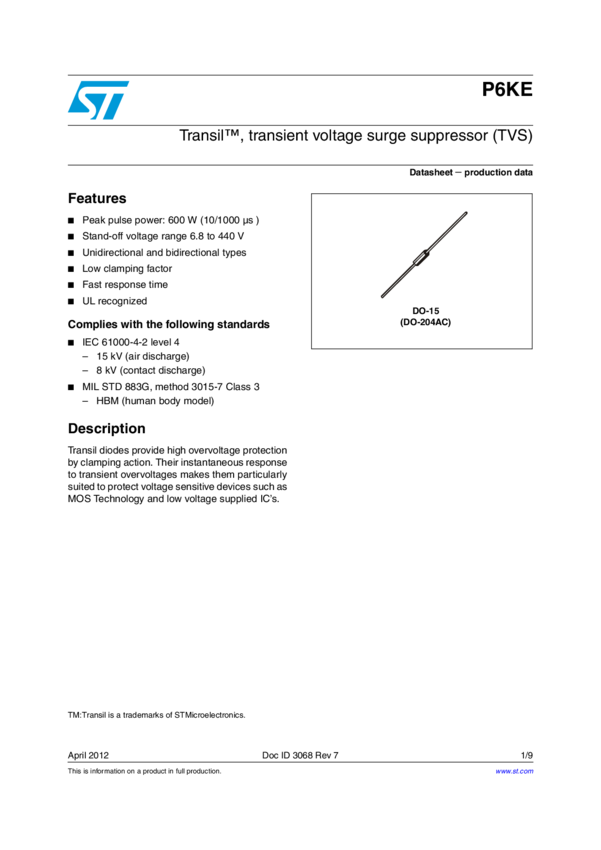 Diode TVS Single Uni-Dir 154V 600W 2-Pin DO-15 T/R