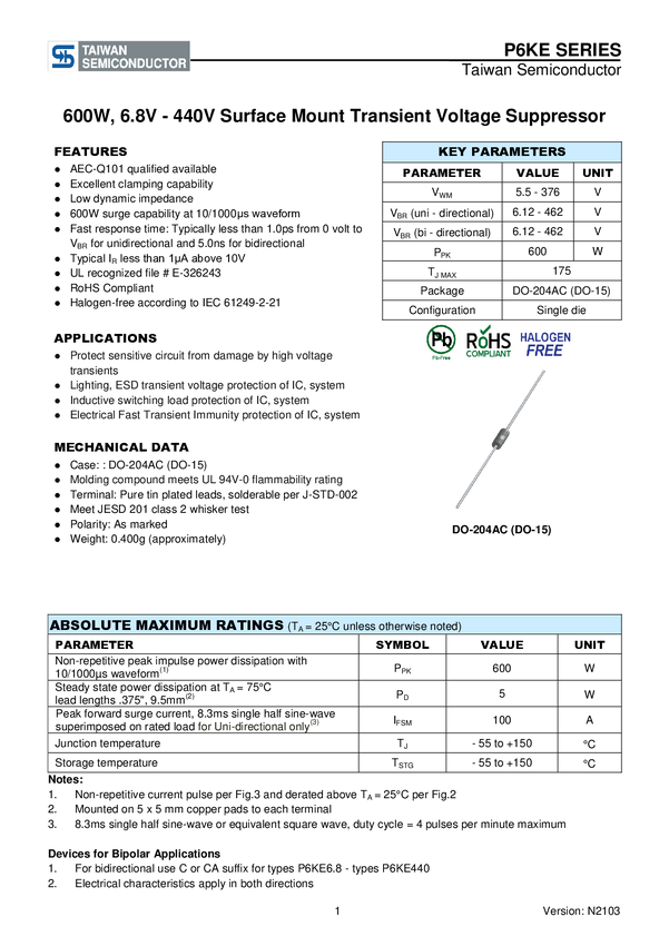 Taiwan Semiconductor Dioda TVS P6KE6.8CA DO-15 taśma na dużej rolce