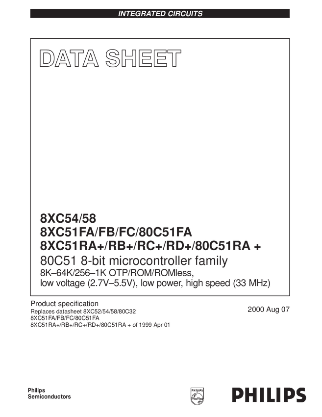80C51 8-bit microcontroller family 8KB/16KB/32KB/64KB OTP, 512B/512B/512B/1KB RAM, low voltage (2.7 to 5.5 V), low power, high speed (30/33 MHz)