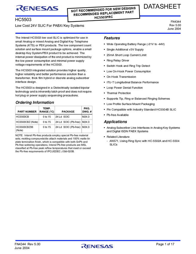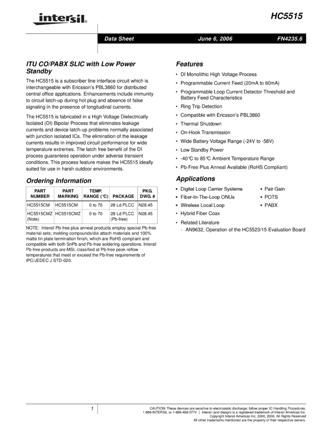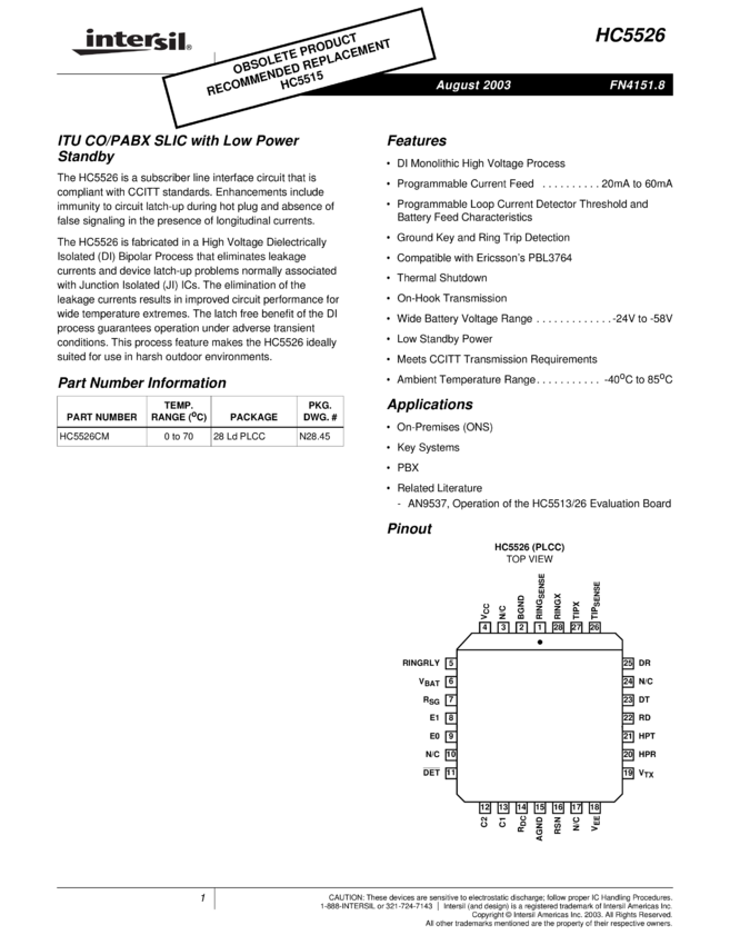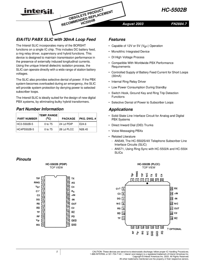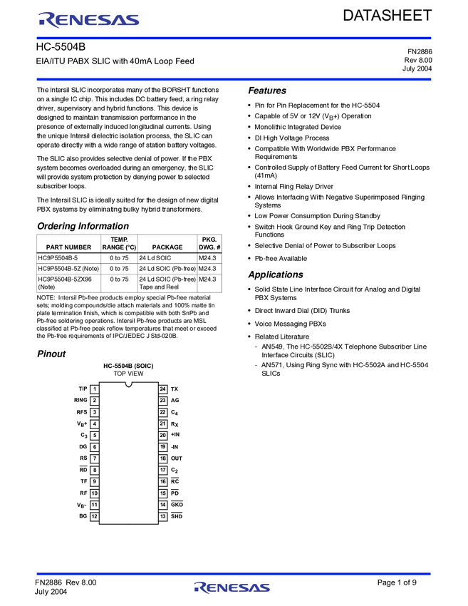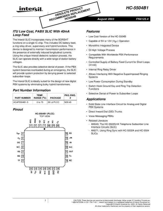ITU Low Cost, PABX SLIC With 40mA Loop Feed