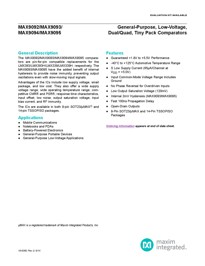 MAX9092, MAX9093, MAX9094, MAX9095 General-Purpose, Low-Voltage, Dual/Quad, Tiny Pack Comparators