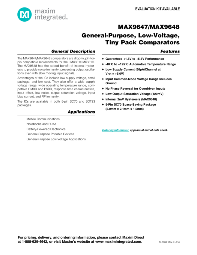 MAX9648 General Purpose, Low-Voltage, Single with Hysteresis, Tiny-Pack Comparators