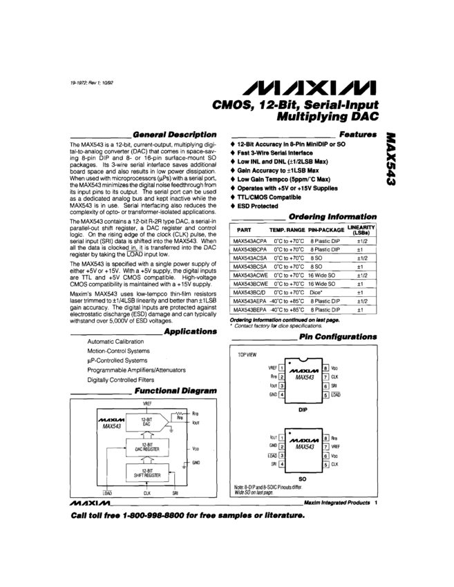 MAX543 Serial, CMOS, Multiplying, 12-Bit DAC in 8-Pin Package