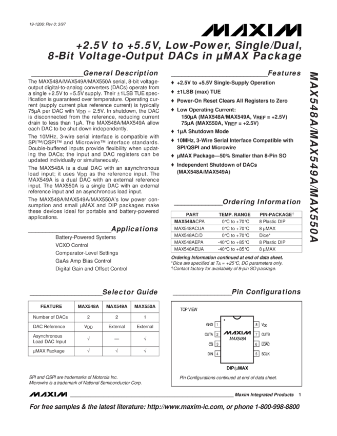 MAX548A, MAX549A, MAX550A +2.5V to +5.5V, Low-Power, Single/Dual, 8-Bit Voltage-Output DACs in µMAX Package