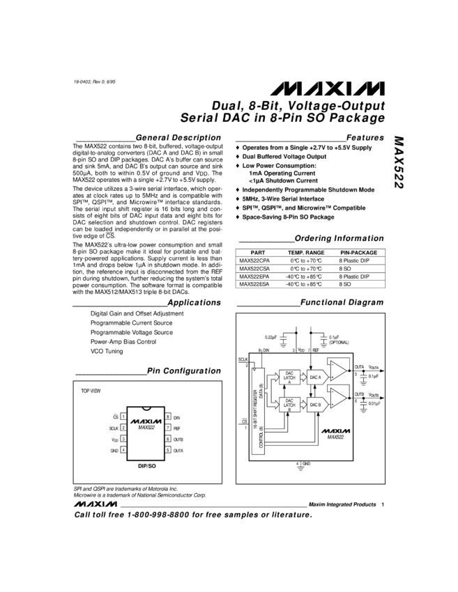 MAX522 Dual, 8-Bit, Voltage-Output Serial DAC in 8-Pin SO Package