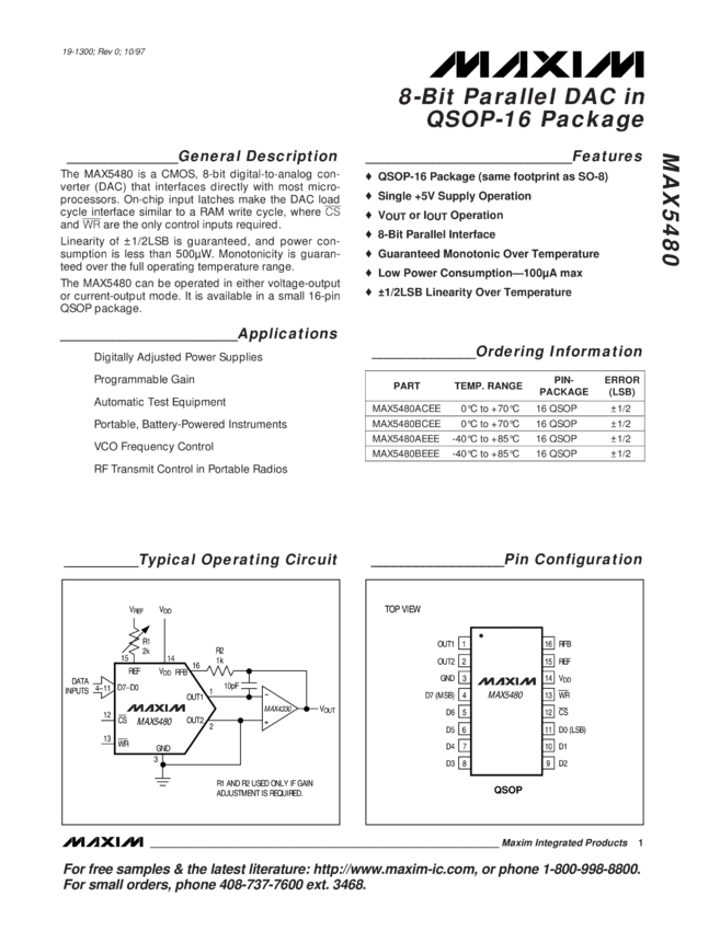 MAX5480 8-Bit Parallel DAC in QSOP-16 Package
