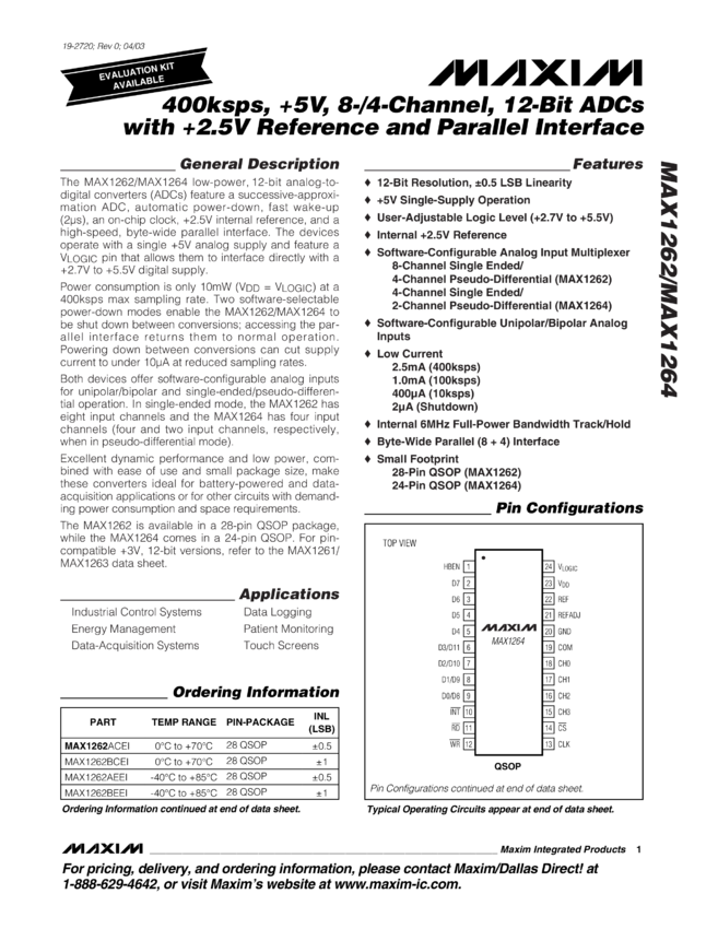 MAX1262, MAX1264 400ksps, +5V, 8-/4-Channel, 12-Bit ADCs with +2.5V Reference and Parallel Interface
